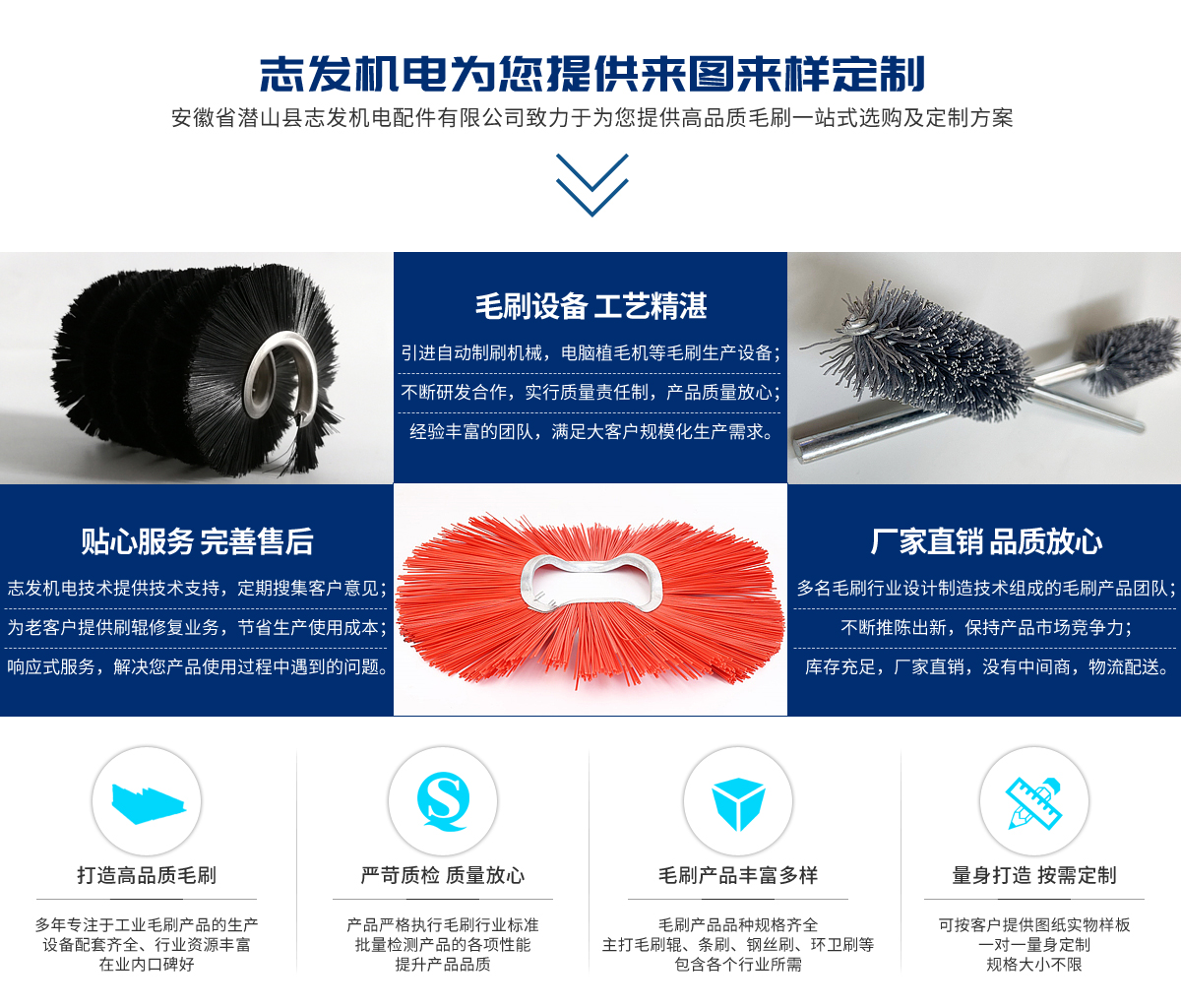 安徽省潛山縣志發(fā)機電配件有限公司是一家大型毛刷生產廠家,公司生產各類管道刷、掃路刷、毛刷輥、條刷、圓盤刷、鋼絲刷、環(huán)衛(wèi)刷、彈簧刷、橡膠輥、毛刷輪、試管刷等毛刷產品。 志發(fā)機電注重企業(yè)文化建設,堅持以人為本、以文化興司,大力培育和弘揚“團結、忠誠、務實、創(chuàng)新”的企業(yè)精神、“鑄就品質創(chuàng)新決定未來”的企業(yè)理念,秉承“從毫厘做起,不留任何遺憾”的質量觀念,堅持自主創(chuàng)新,將公司發(fā)展成為潛山毛刷基地品質生產商...